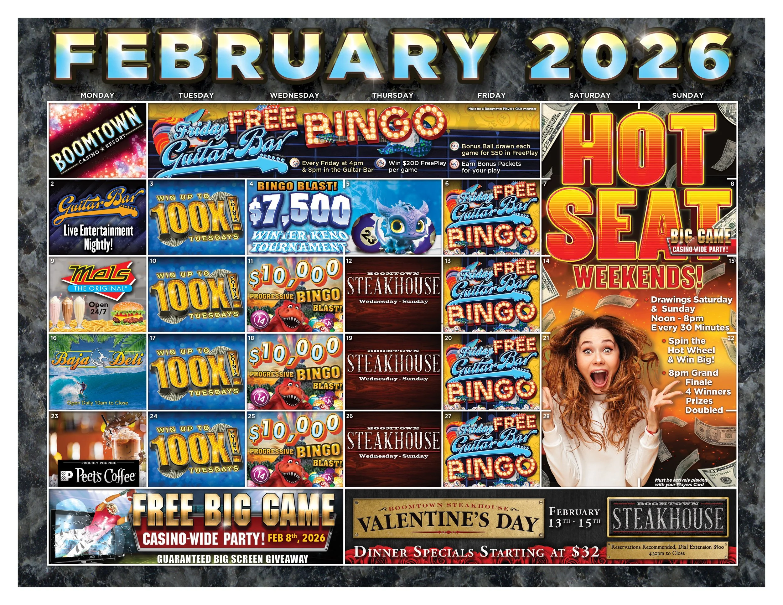 There’s always something exciting happening at Boomtown Casino Resort! From thrilling giveaways and drawings to Free Play offers and exclusive Player’s Club rewards, our promotions give you more ways to win every time you visit.